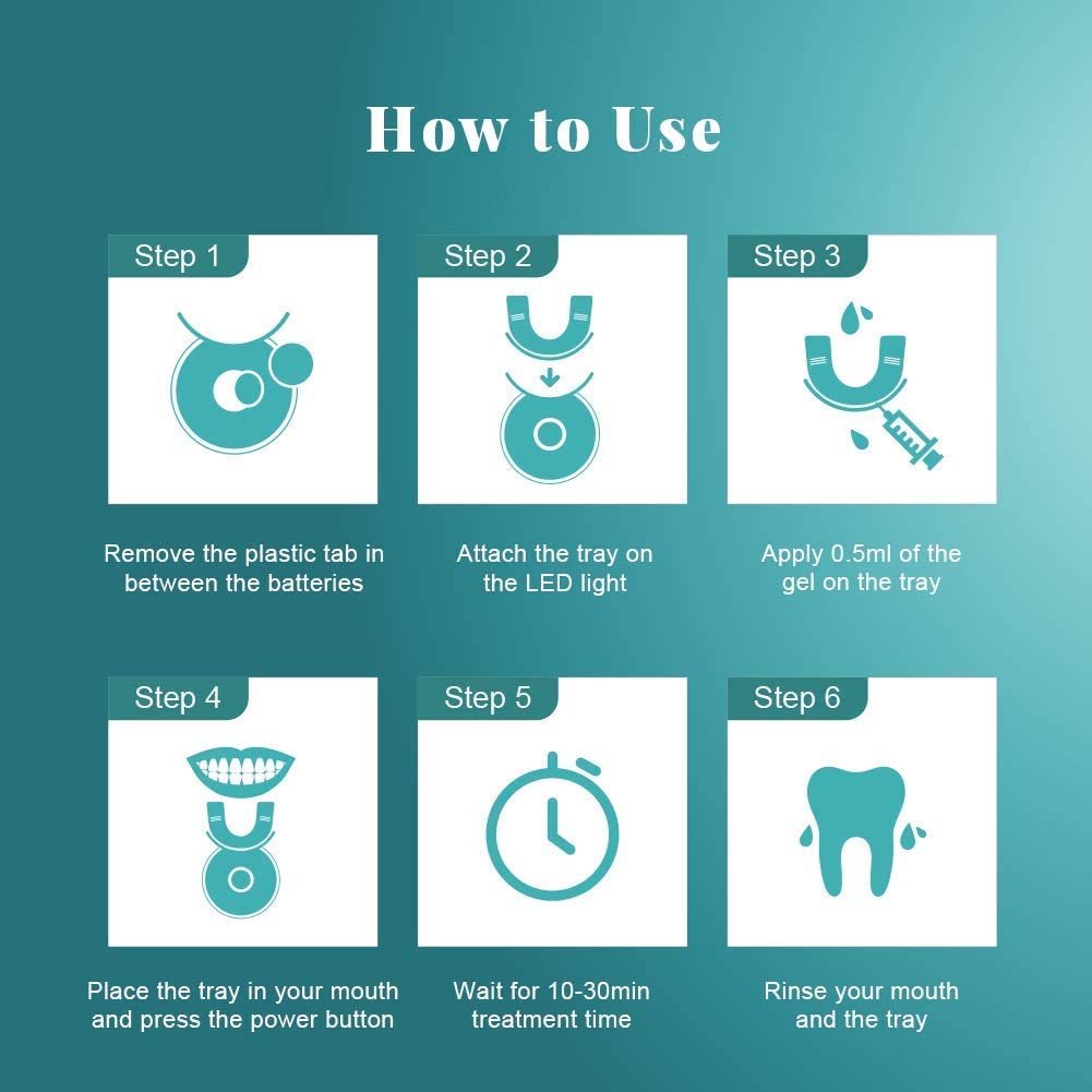 El tratamiento de blanqueamiento dental que recomienda el fabricante consiste en sesiones de 10 a 30 minutos durante 7 a 10 días consecutivos para obtener resultados de blanqueamientos completos